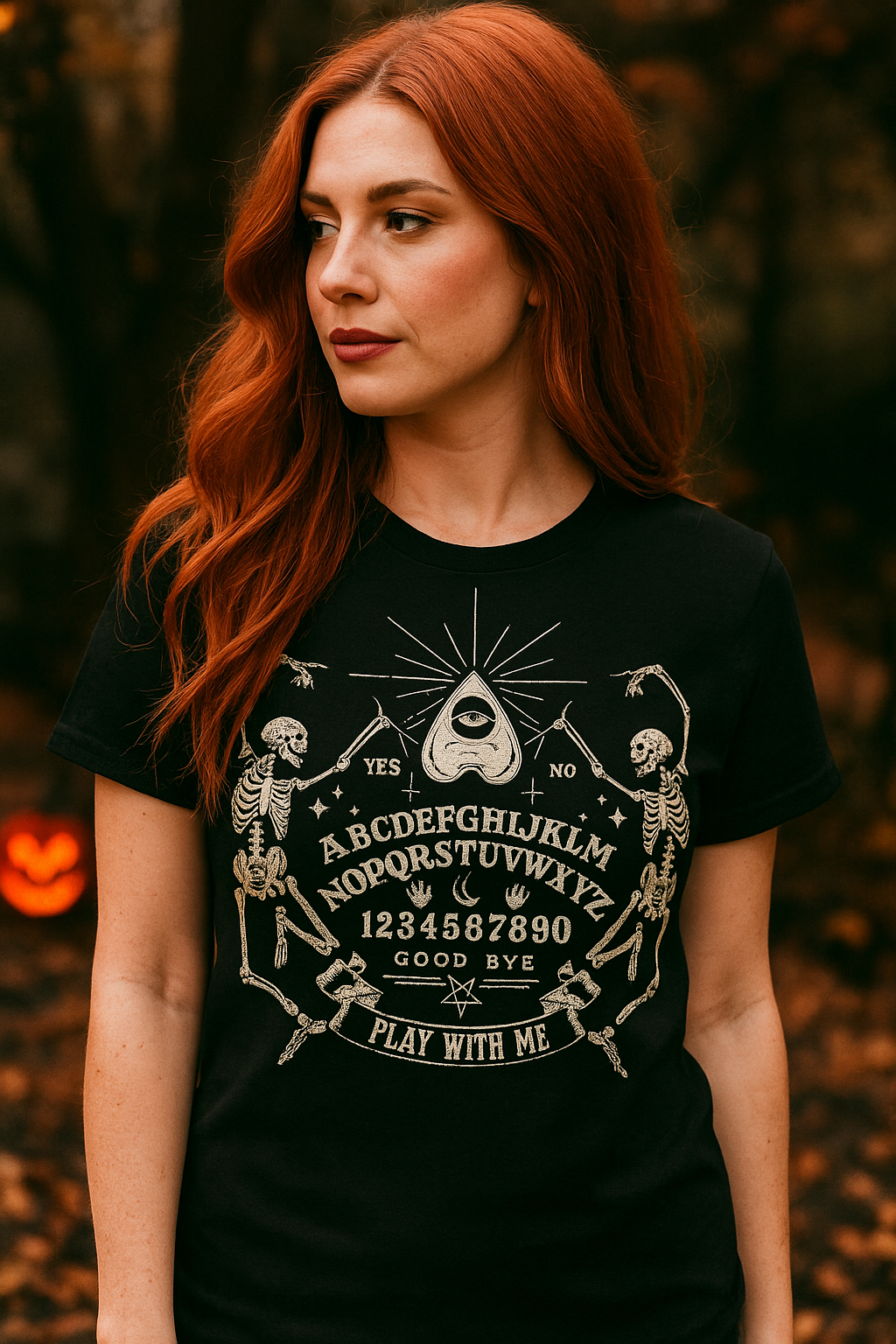 This Gothicc original tee is a bewitching blend of the occult and the ornate, featuring a Ouija board design reimagined with playful skeletons, ouija board, all-seeing planchette that dares you to play. Balanced with gothic elegance and ritualistic flair, it's a call to the curious… and a warning to the weak.
